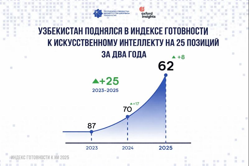 В последние годы Узбекистан демонстрирует устойчивый рост в Индексе готовности к искусственному интеллекту (AI Readiness Index). Согласно результатам рейтинга, опубликованного международным аналитическим центром Oxford Insights, в 2023 году страна занимала 87-е место, а к 2025 году улучшила свой показатель сразу на 25 позиций.